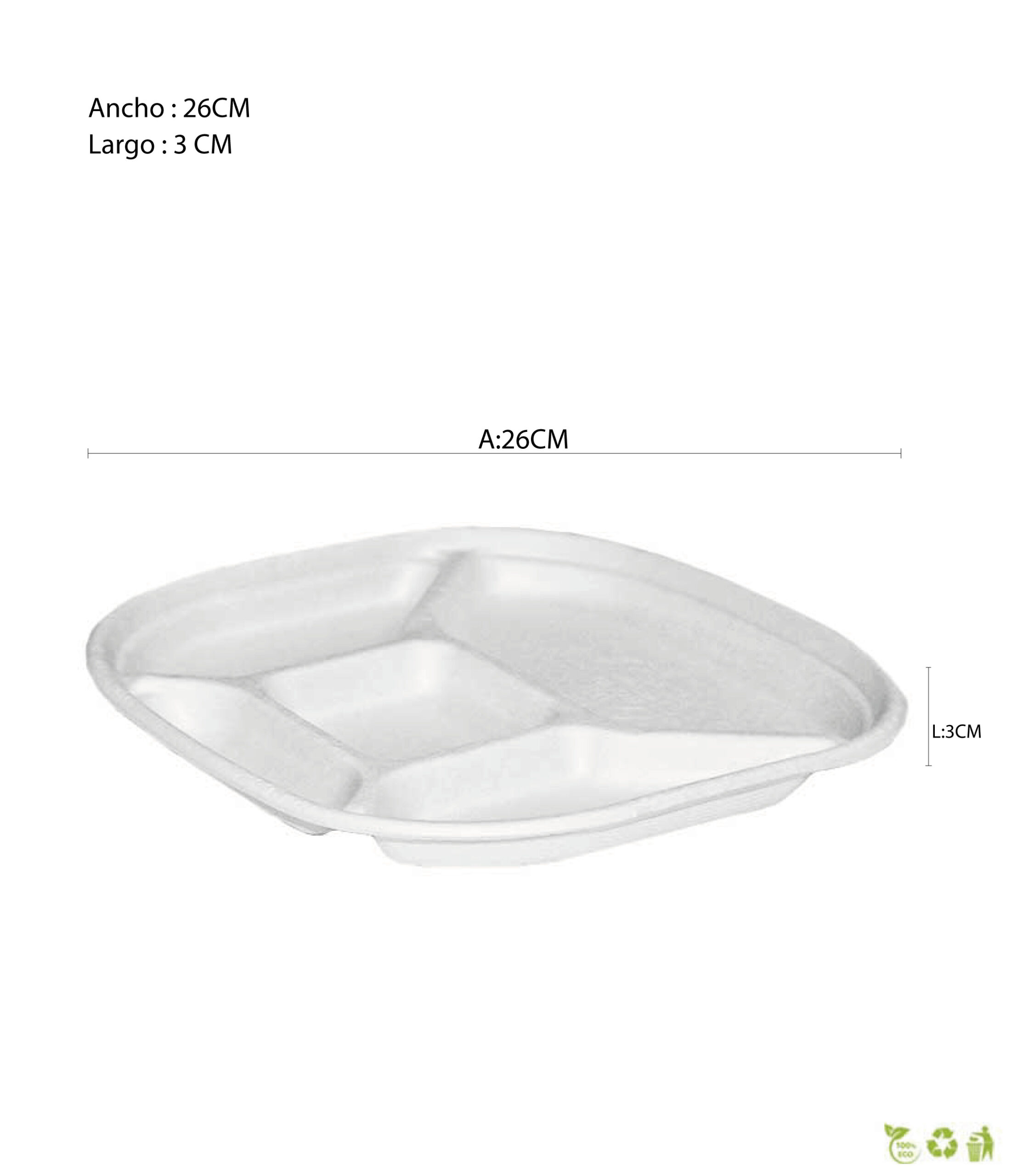 Bandeja redondeada con 5 divisiones, elaborada en bagazo de caña de azúcar. Mide 26 x 26 x 3 cm y es 100% biodegradable y compostable. Resistente al calor, apta para microondas y perfecta para separar diferentes alimentos sin que se mezclen. Ideal para comidas rápidas, catering, menús ejecutivos y alimentos para llevar.