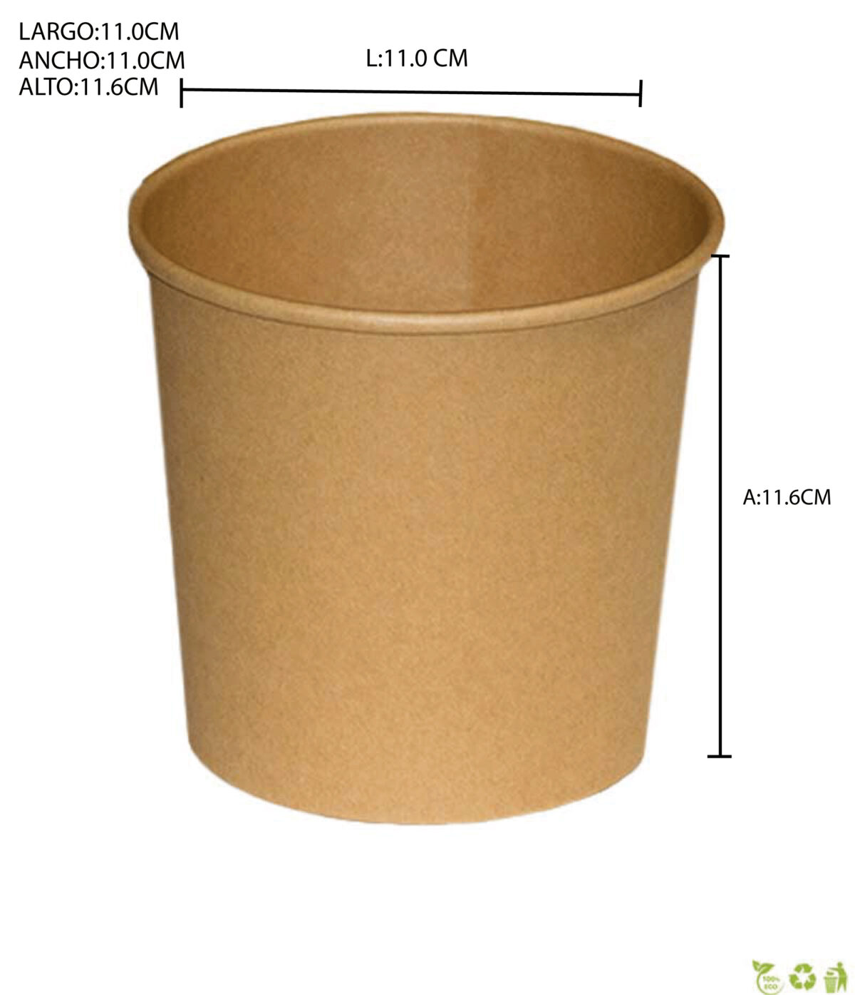 Bowl de sopa de papel Kraft de 26oz, biodegradable y resistente a líquidos, ideal para sopas y guisos. Medidas: 11x11x11.6cm.