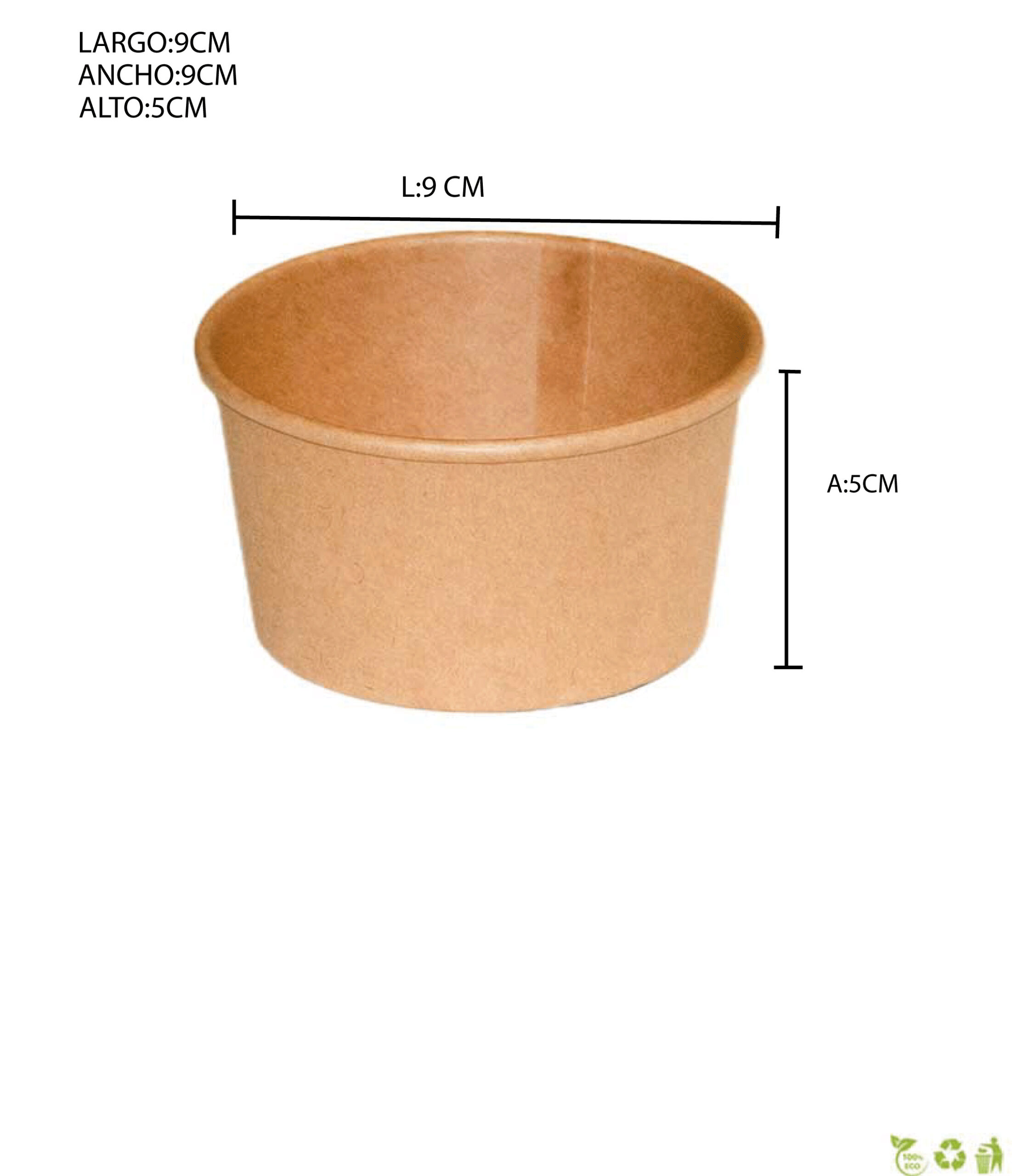 Contenedor de papel Kraft de 6 onzas, con 9 cm de diámetro superior y 5 cm de altura. Biodegradable y resistente, ideal para porciones individuales de alimentos fríos y calientes, con un acabado natural y ecológico.